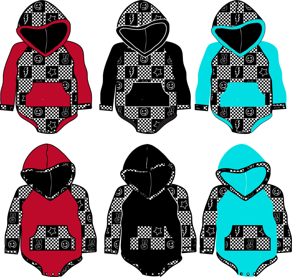 Our MM rompers are SUPER SOFT,HAND-MADE in USA, custom printed, super soft double brushed poly fabric, and supports small business!  Signature color blocking, front kanga pocket, contrast hood cuffs.