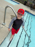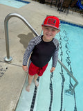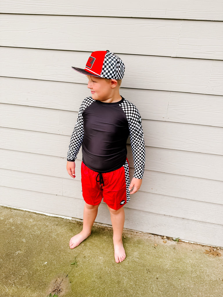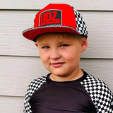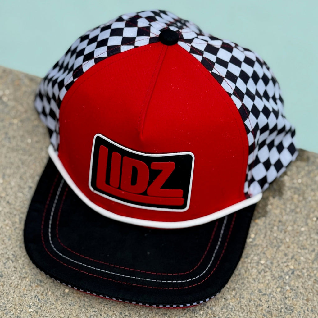 Our RED & Checkerboard Signature LIDZ snapback is the perfect hat for your littles for summer and all year round!!  This waterproof hat features a beautiful red waterproof, bolt laser cut fabric, rubber logo patch, crisp white rope,  checker sandwich print, checker taping, and contrast stitching on brim.