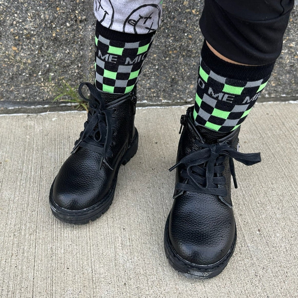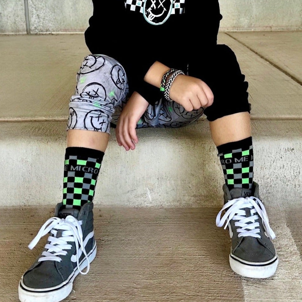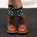 Our Black/Green/Grey checkerboard socks are lightweight, stretchy, and super comfortable! The print is our signature, and versatile for all your winter outfits!