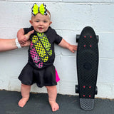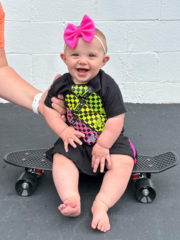 Neon skateboards in checkerboard....of course! Skate inspired tees for babies, toddlers, kids, youth, and even matching styles for mom & dad! Our tees our fashionable and soft! Made from a soft cotton-poly blend these will quickly become a fave in the closet!