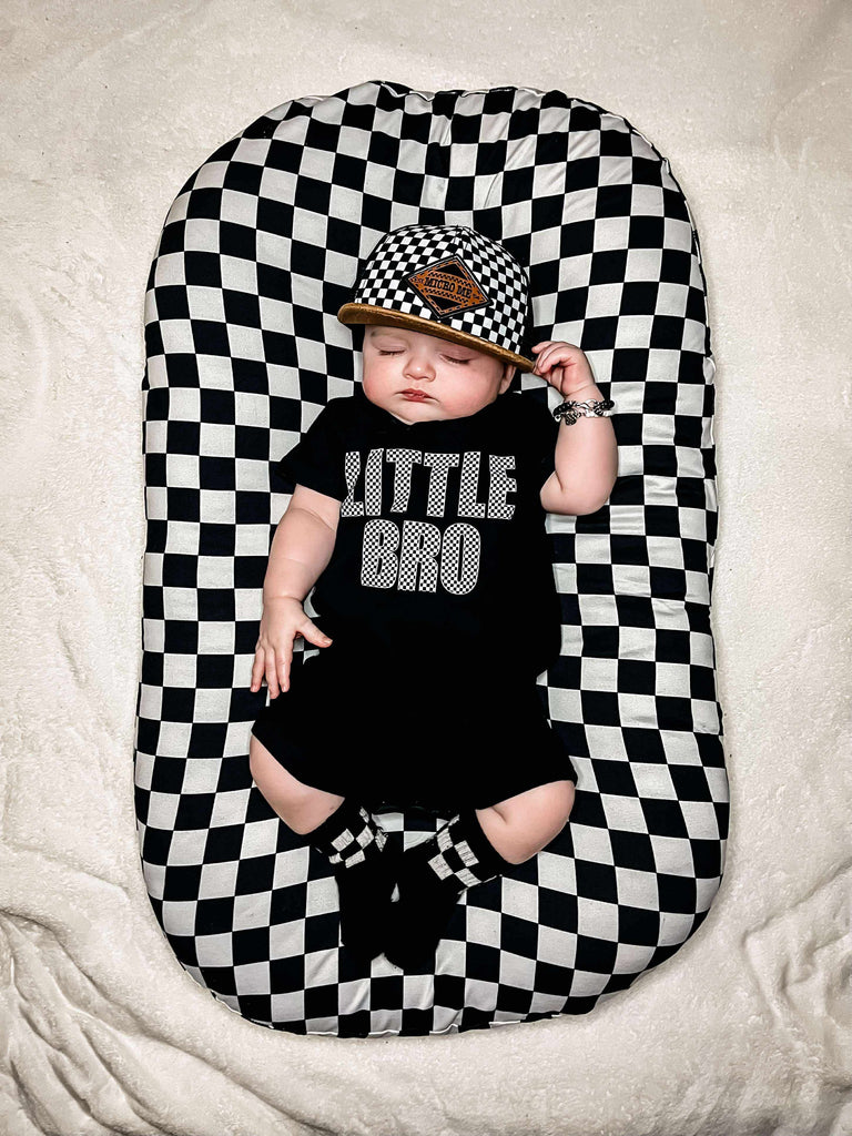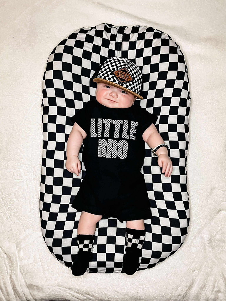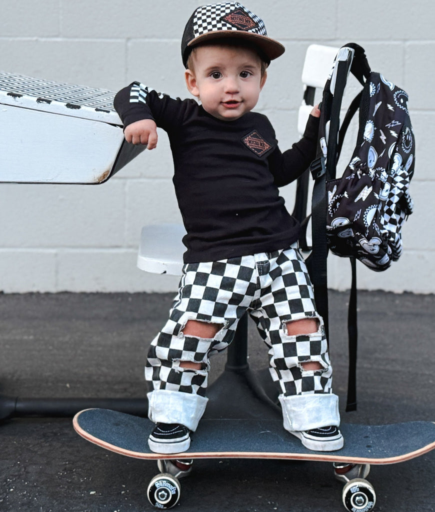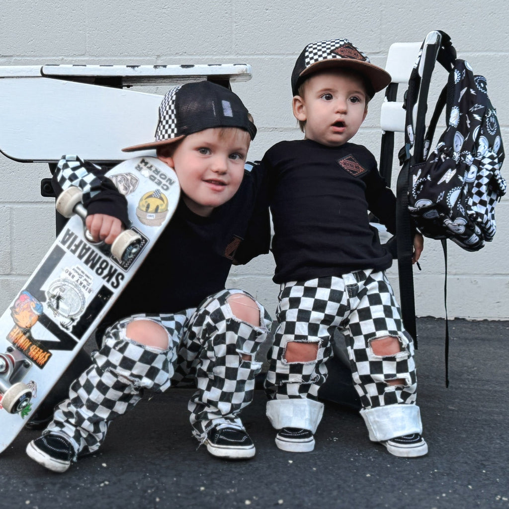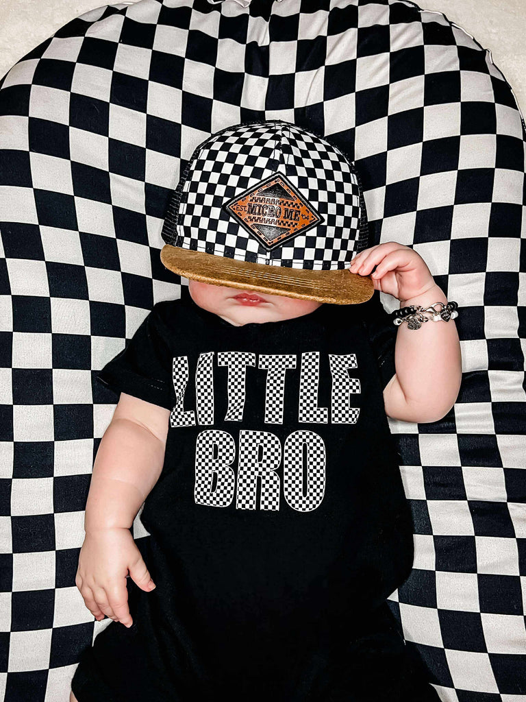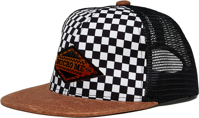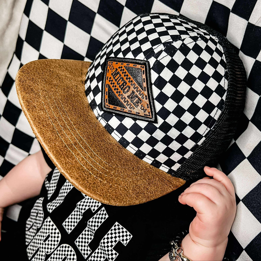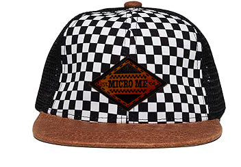 Micro Me Lidz....for all your snapback and trucker needs infant to adult sizes! This Lidz features our signature B&W checks with a faux leather brim. Mesh trucker style, with adjustable snapback.