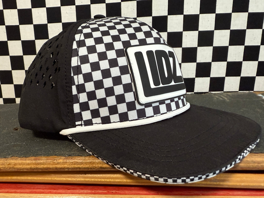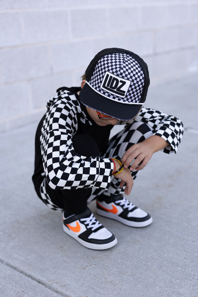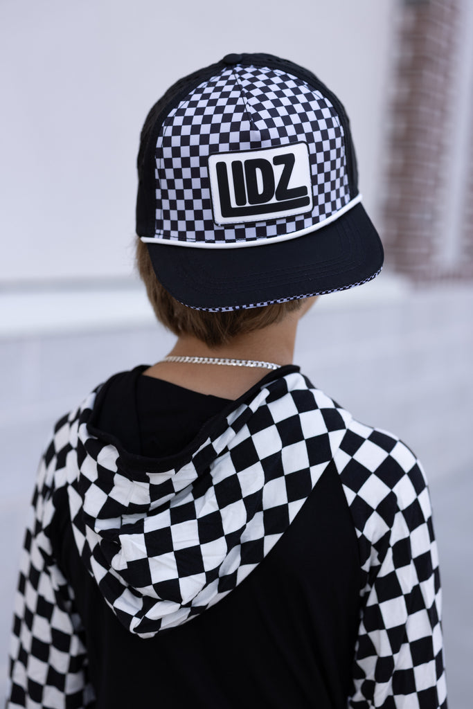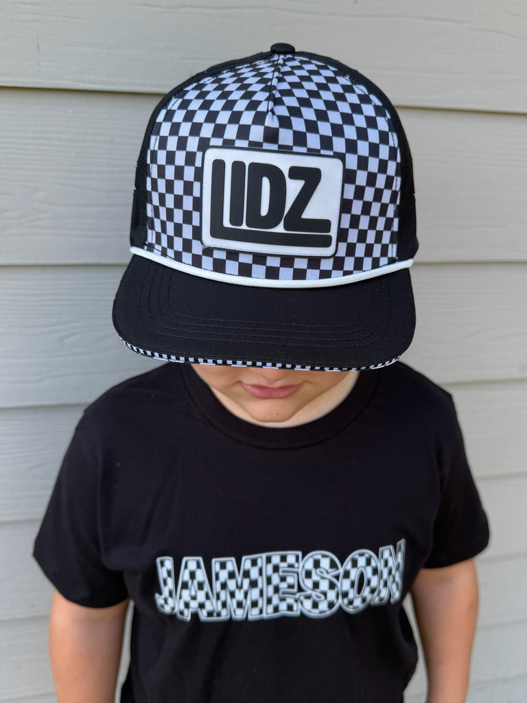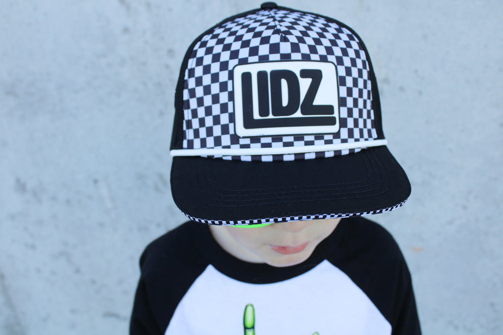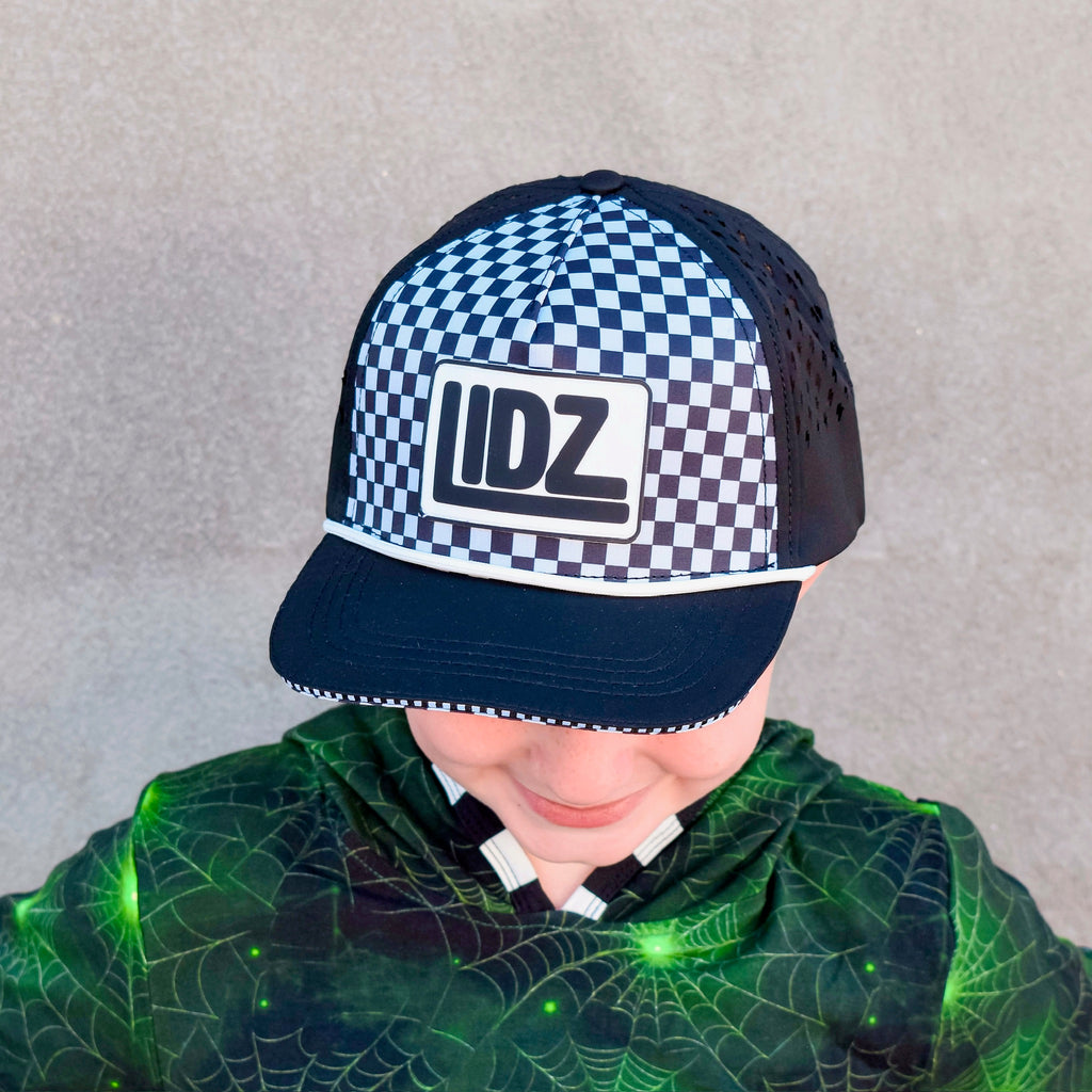 Our CHECKERBOARD Signature LIDZ snapback is the perfect hat for your littles for all year round!!  This waterproof hat features a classic checkerboard pattern mixed with laser bolt cut waterproof black fabric!  Rubber patch, crisp white rope,  checkerboard under brim, checker sandwich print, checker taping, and contrast stitching on brim.