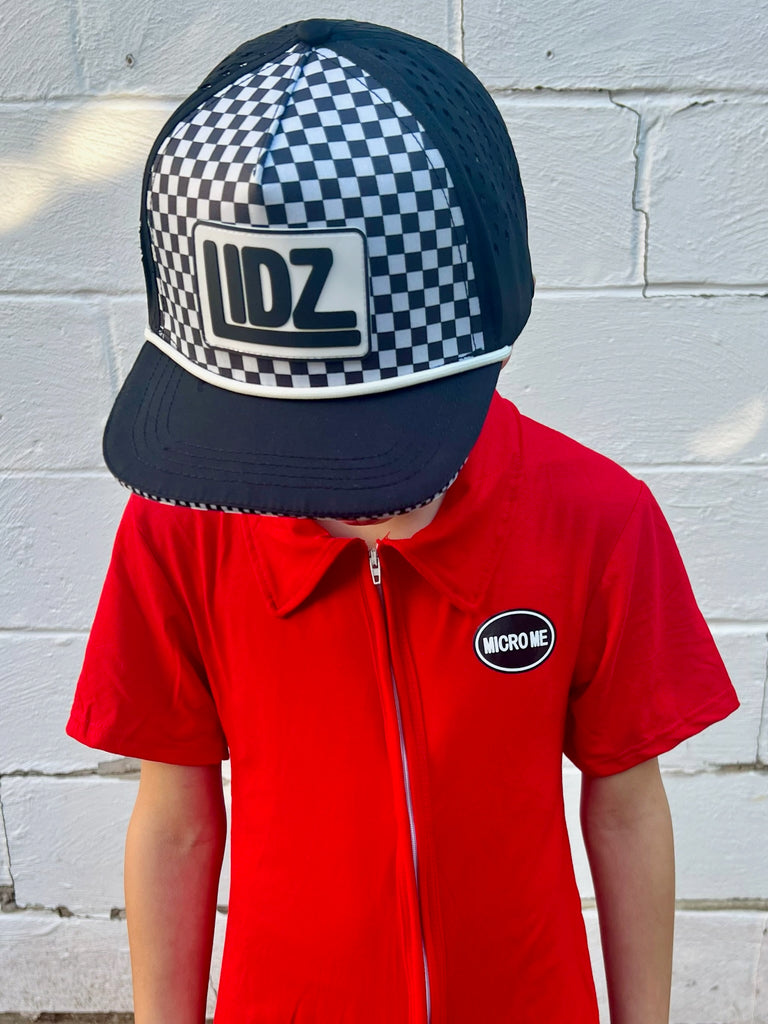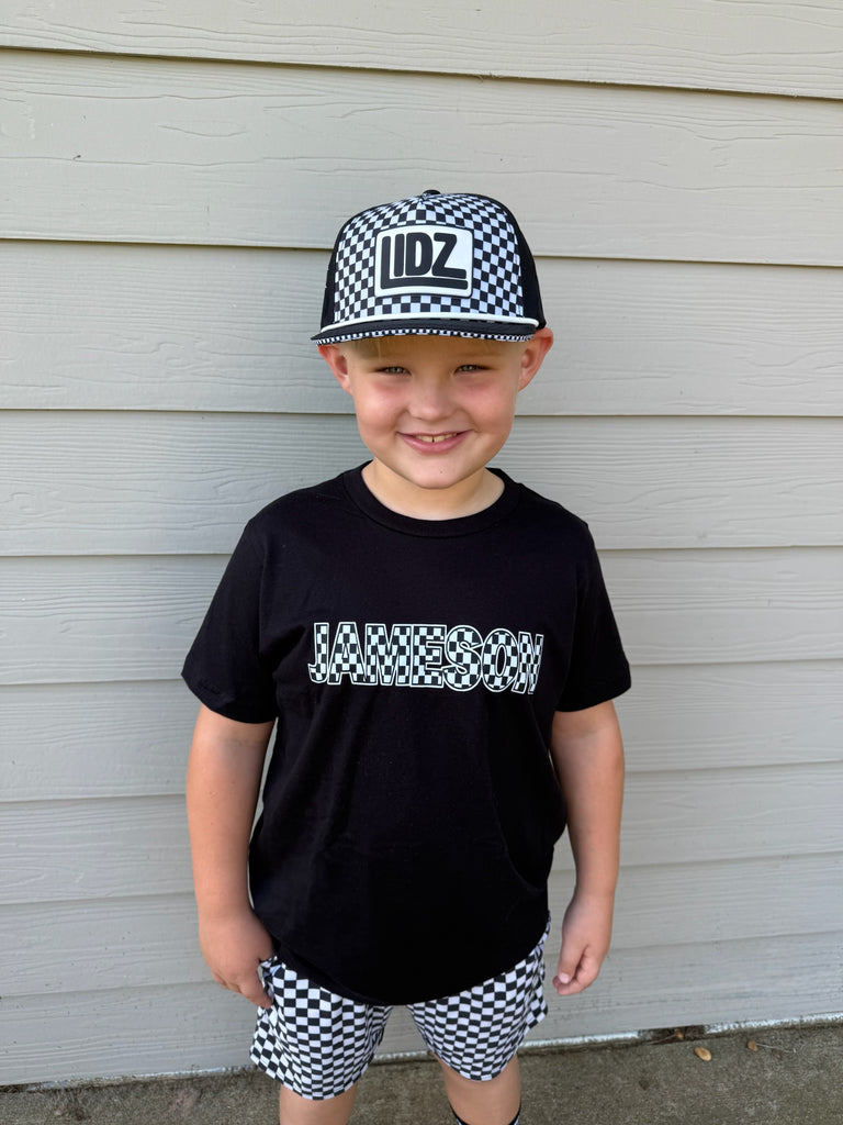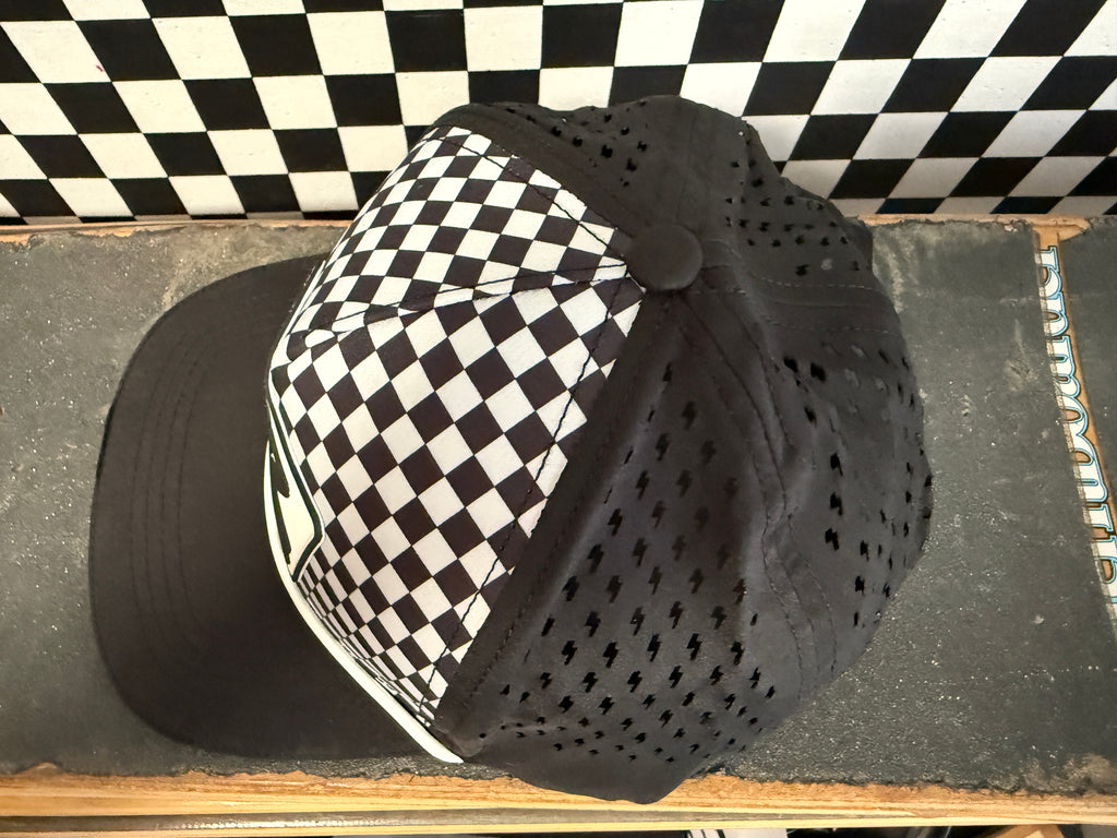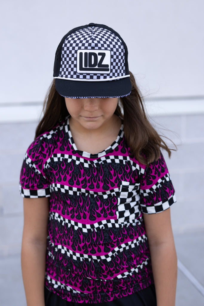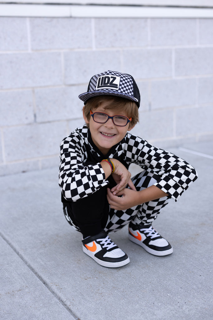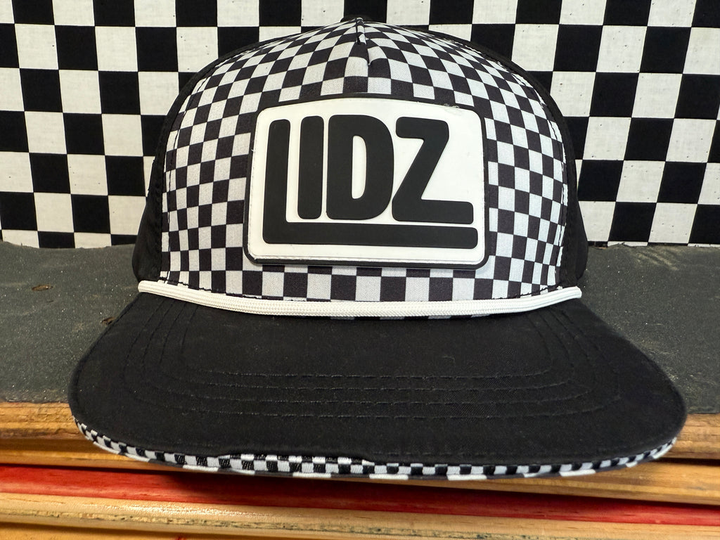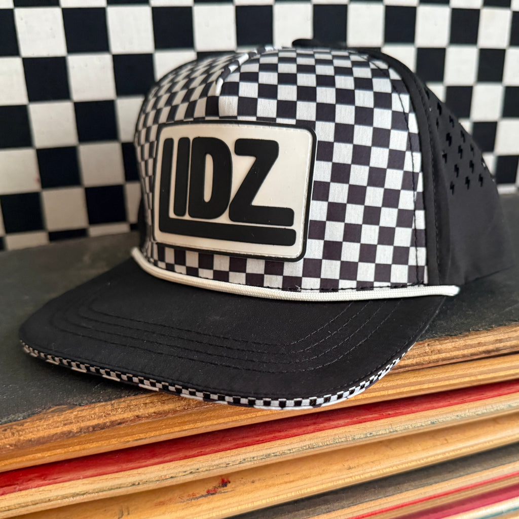 Our CHECKERBOARD Signature LIDZ snapback is the perfect hat for your littles for all year round!!  This waterproof hat features a classic checkerboard pattern mixed with laser bolt cut waterproof black fabric!  Rubber patch, crisp white rope,  checkerboard under brim, checker sandwich print, checker taping, and contrast stitching on brim.