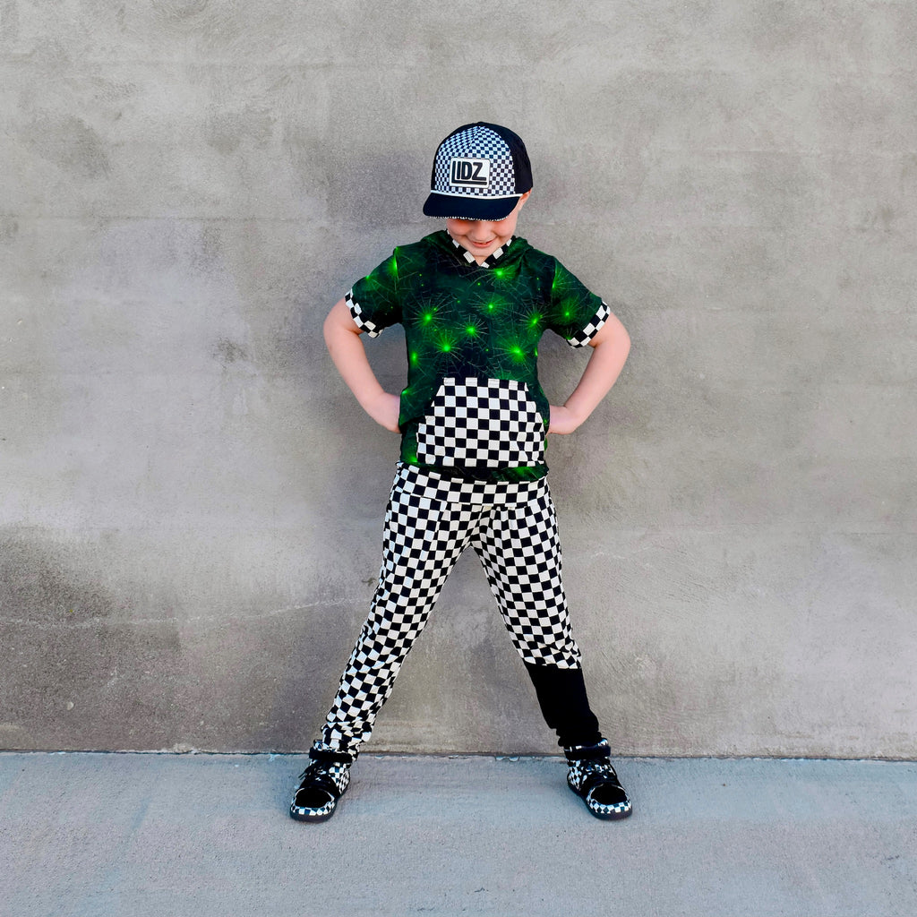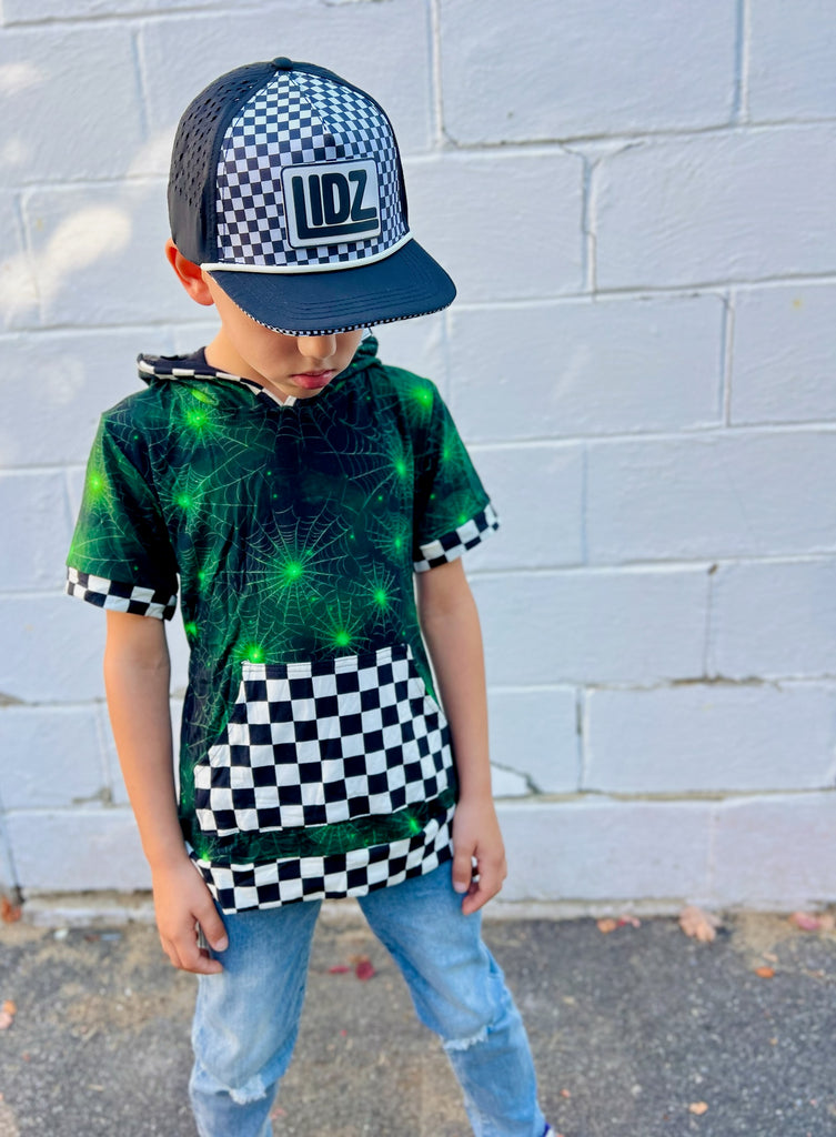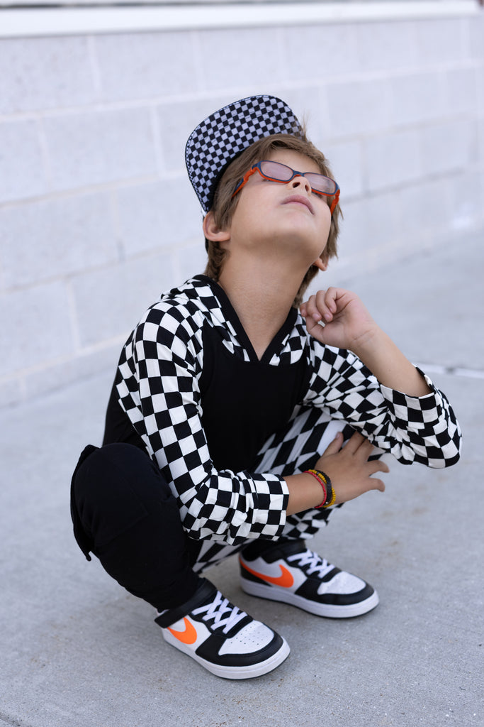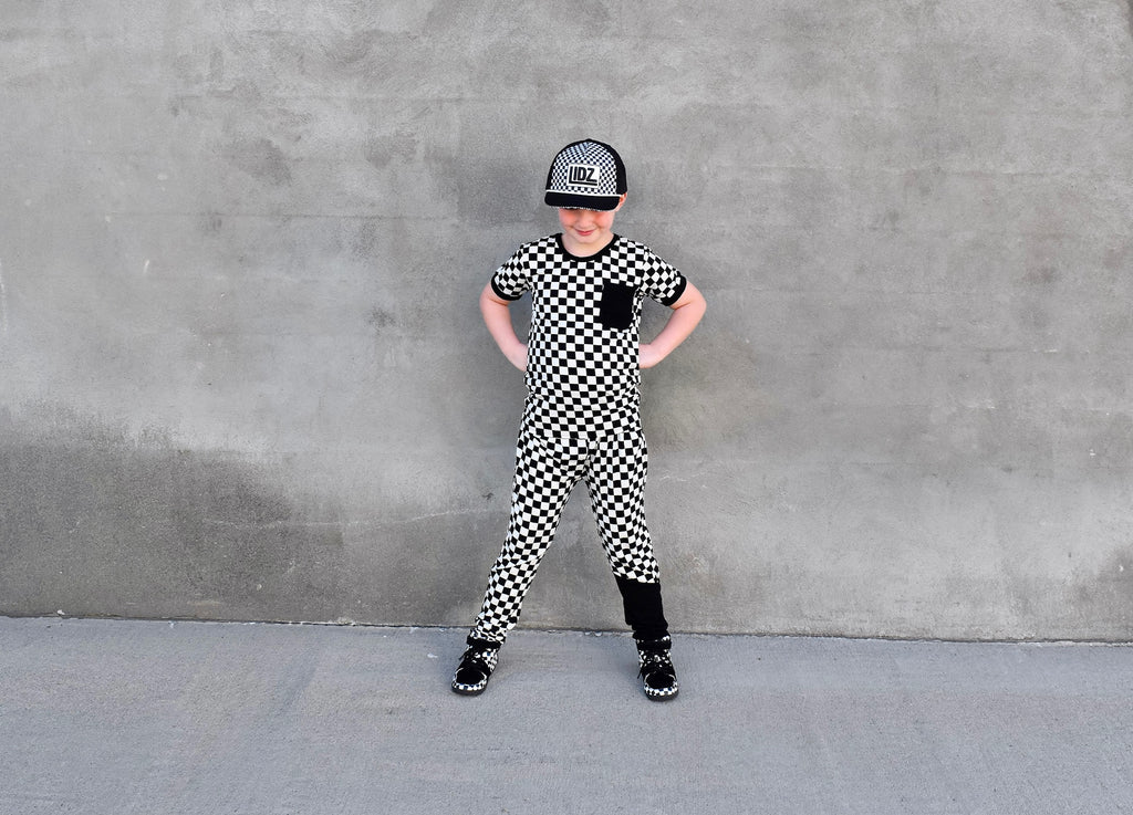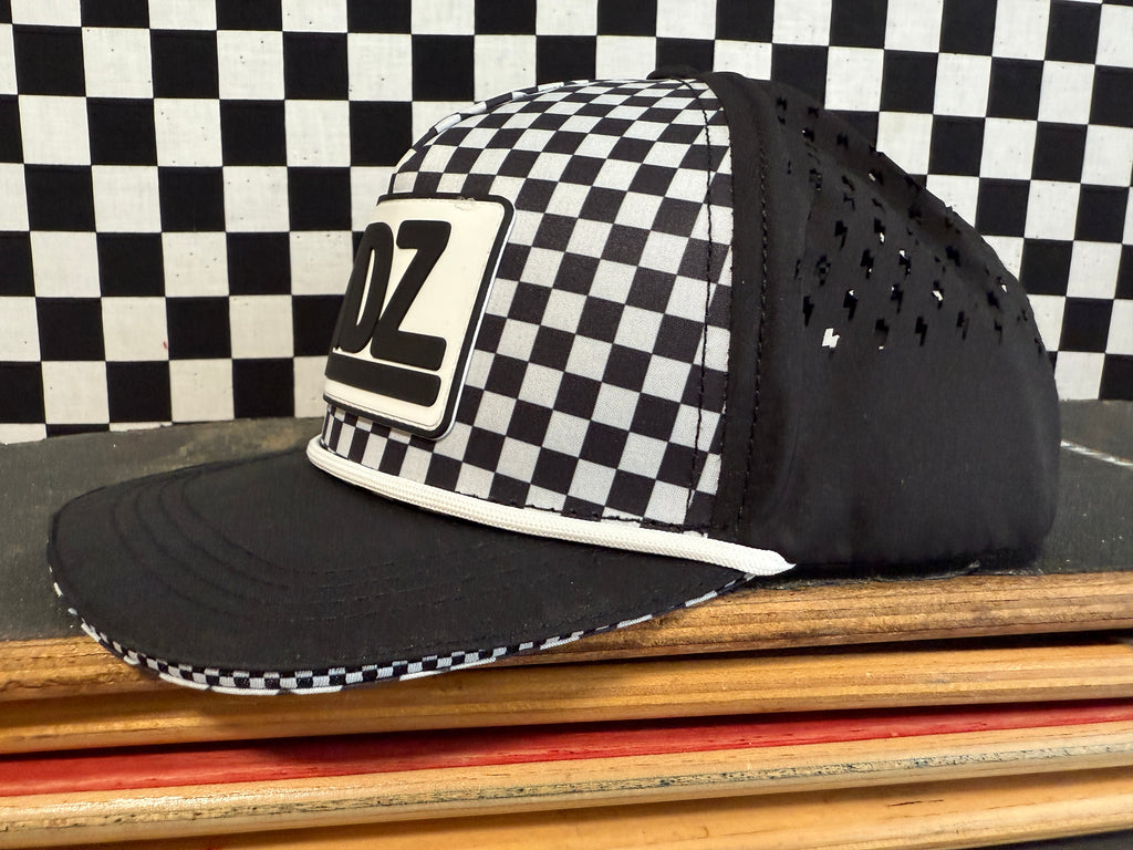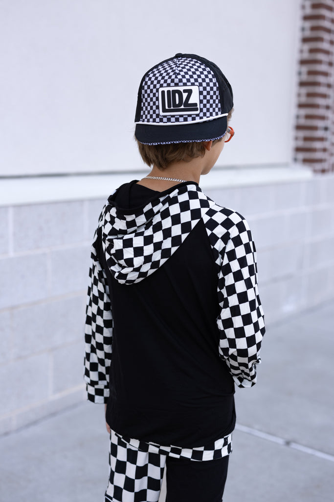 Our CHECKERBOARD Signature LIDZ snapback is the perfect hat for your littles for all year round!!  This waterproof hat features a classic checkerboard pattern mixed with laser bolt cut waterproof black fabric!  Rubber patch, crisp white rope,  checkerboard under brim, checker sandwich print, checker taping, and contrast stitching on brim.
