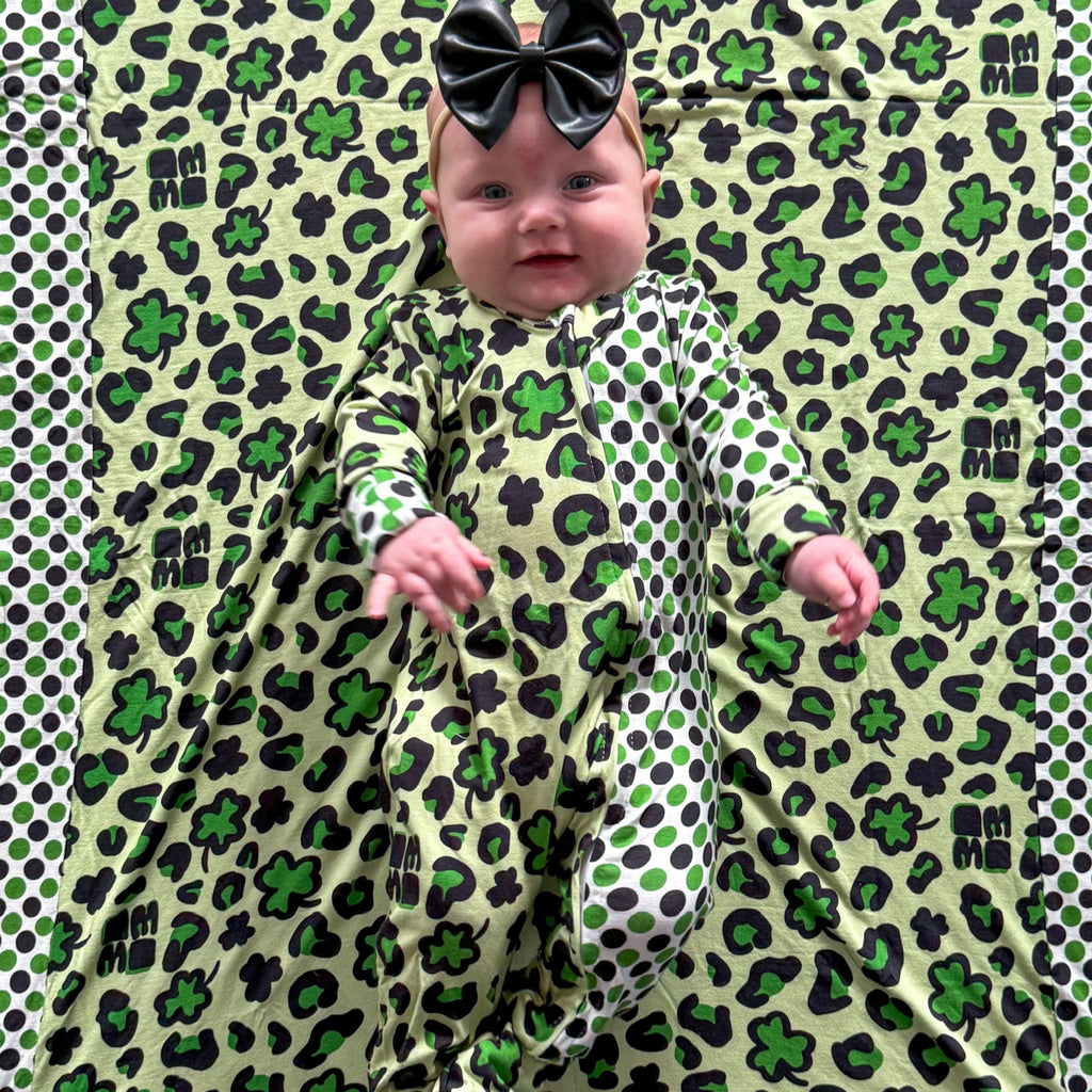 ARROW Zippy are long jammies with double zippers (zips from top and bottom for easy changes!) . Sizes up to 24M have the extra long/folded cuff to fold over their hands and feet. This LUCKY LEOPARD mixes a fun clover leopard print and green mini dots for the cutest look for your little for St. patty's day and all year round!!