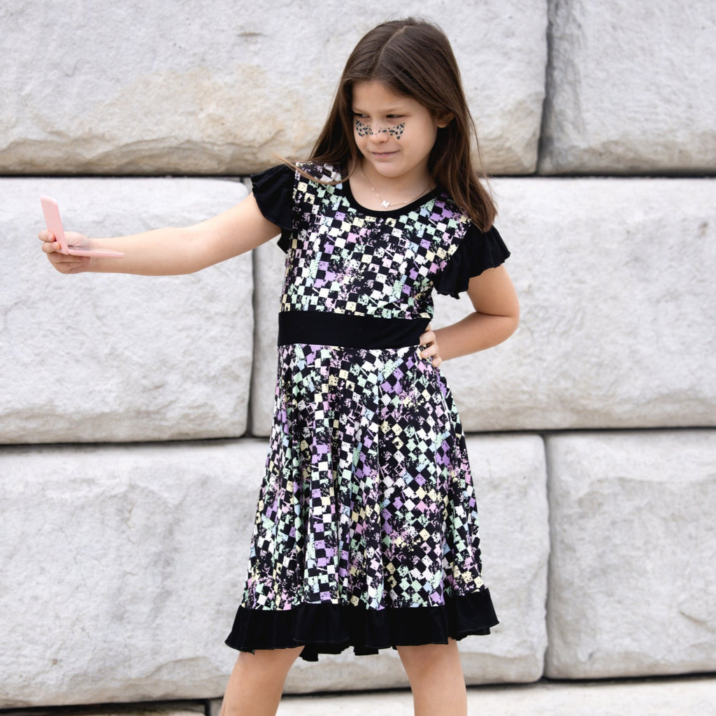 Our new RAVEN bamboo twirl dresses are a hit!! Your little gal will love showing her twirl in this fun mixed print dress with criss-cross backing. This style mixes two fun prints for the cutest look for your littles!!