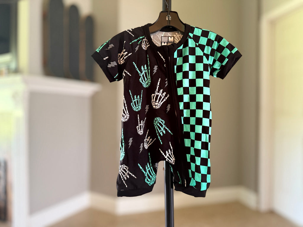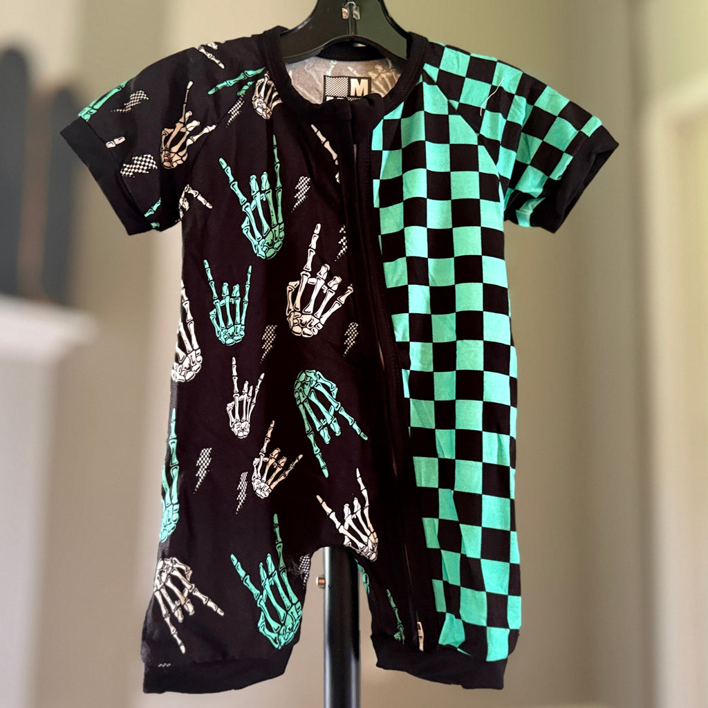 SAWYER Zippys are shorts and short sleeved bamboo romper. Featuring double zippers (zips from top and bottom for easy changes!) This style mixes two fun prints for the cutest look for your littles!!  All of our bamboo styles use our premium 250gsm bamboo fabric.