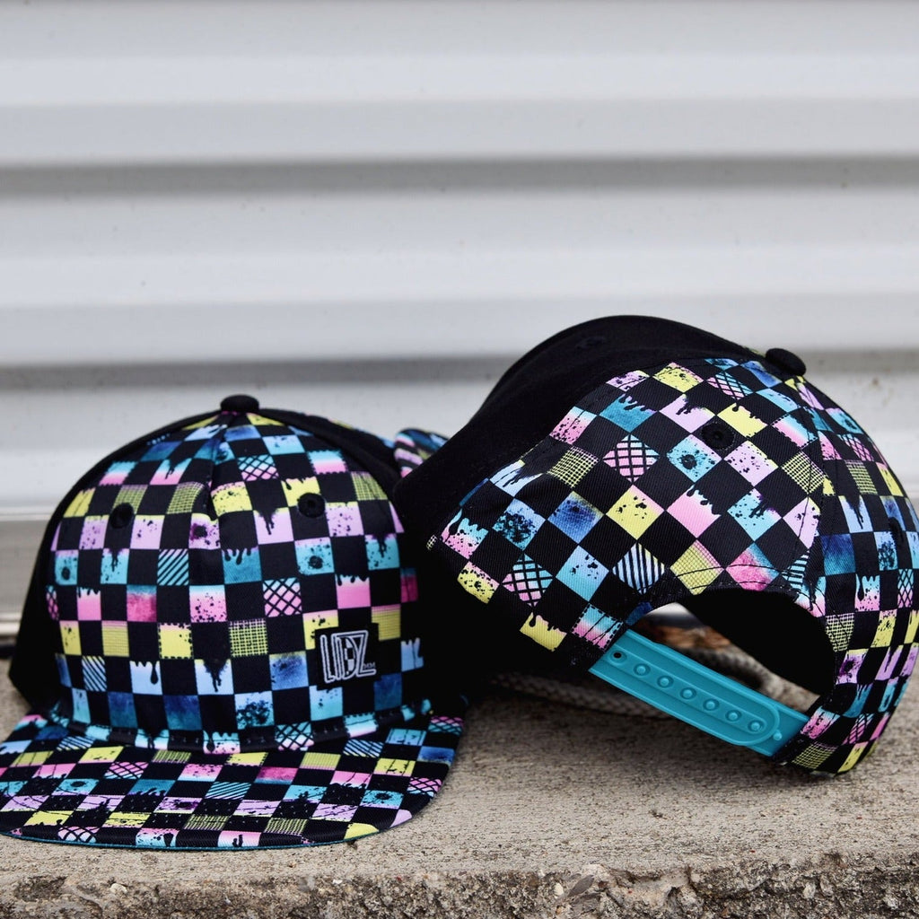 5 panels, snapback, flat brim, checkerboard tape, Lidz woven label. Full cloth panels, summer chill checks print, Teal underbrim, teal snaps.