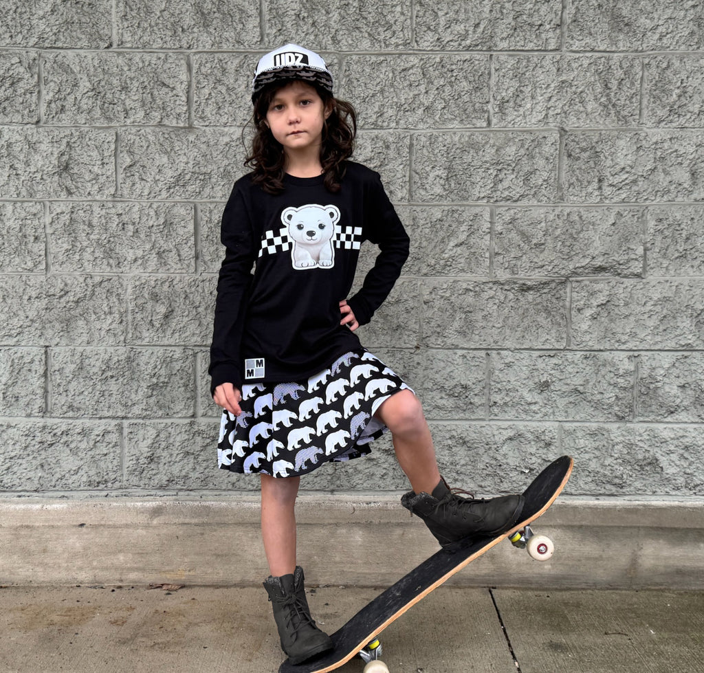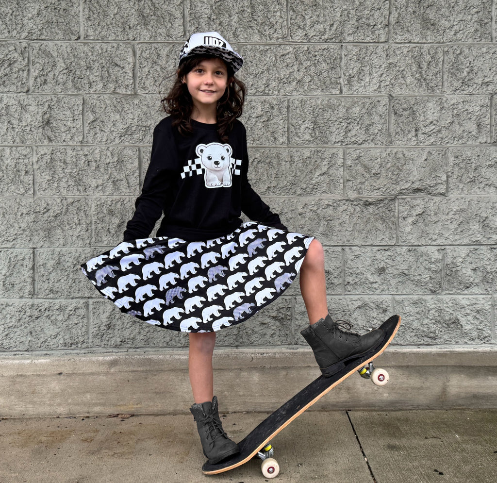 These skater skirts are designed with comfort and style in mind, featuring a relaxed fit, elastic waistband, and pockets! . The double brushed poly fabric ensures a soft and cozy feel, perfect for lounging or active play. The unique prints make each skirt a special piece in your wardrobe.