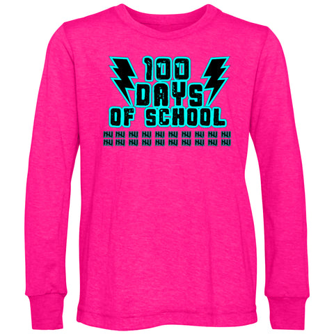 100 Days of School BOLT LS Shirt, Hot Pink (Toddler, Youth, Adult)