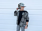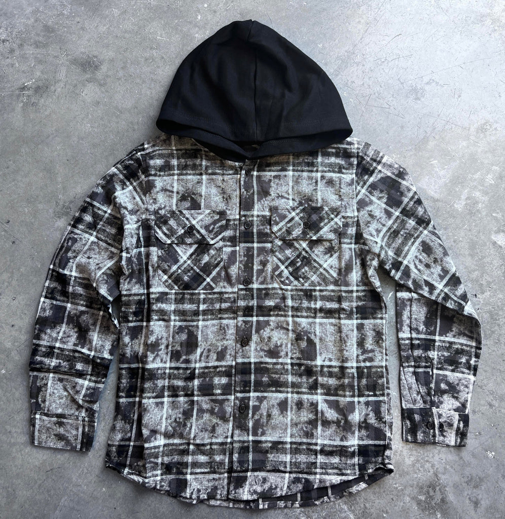 Acid washed plaid shackts. Flannel material, hooded, black buttons. PERFECTION. Size up for layering