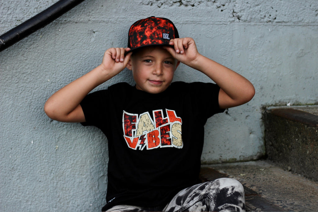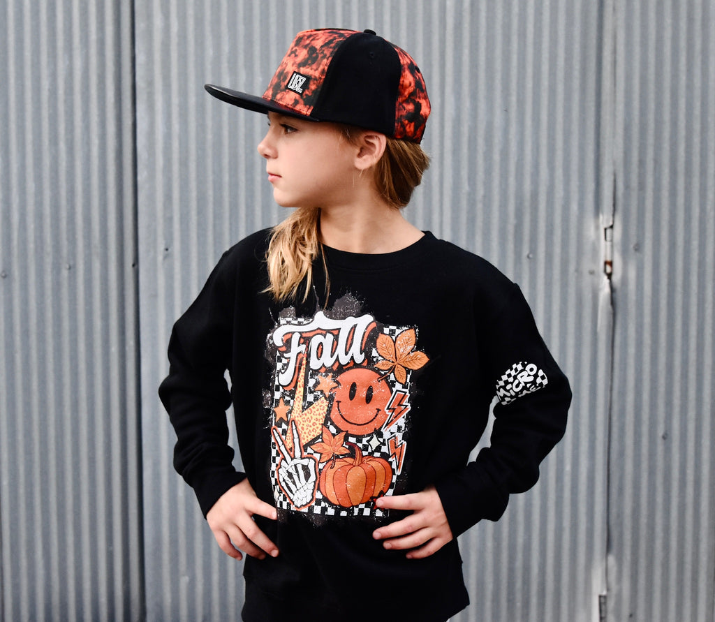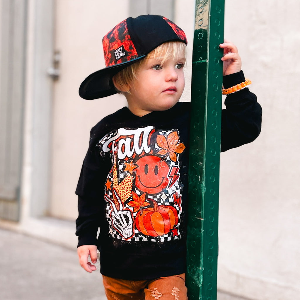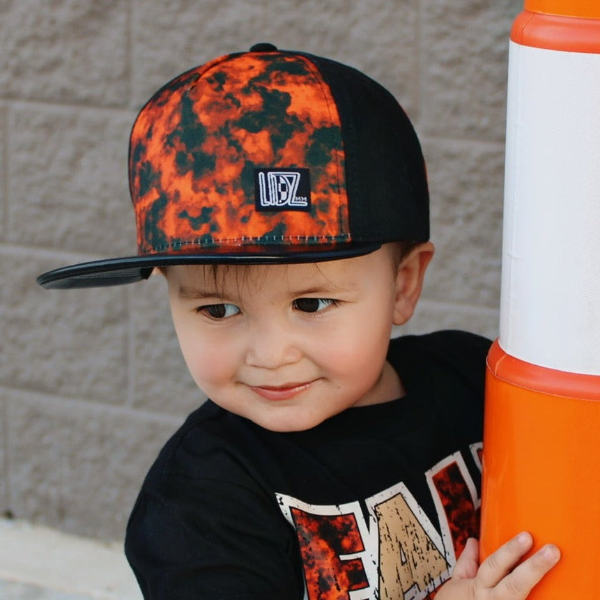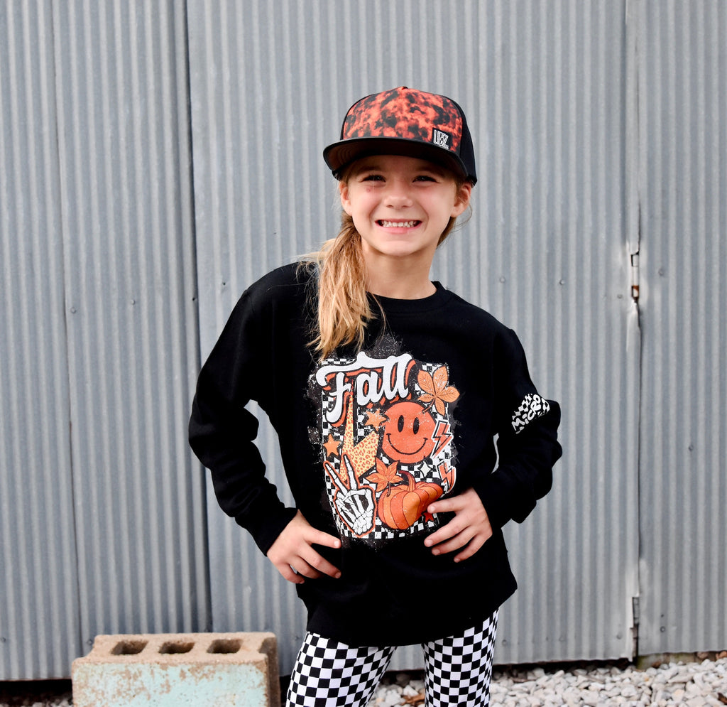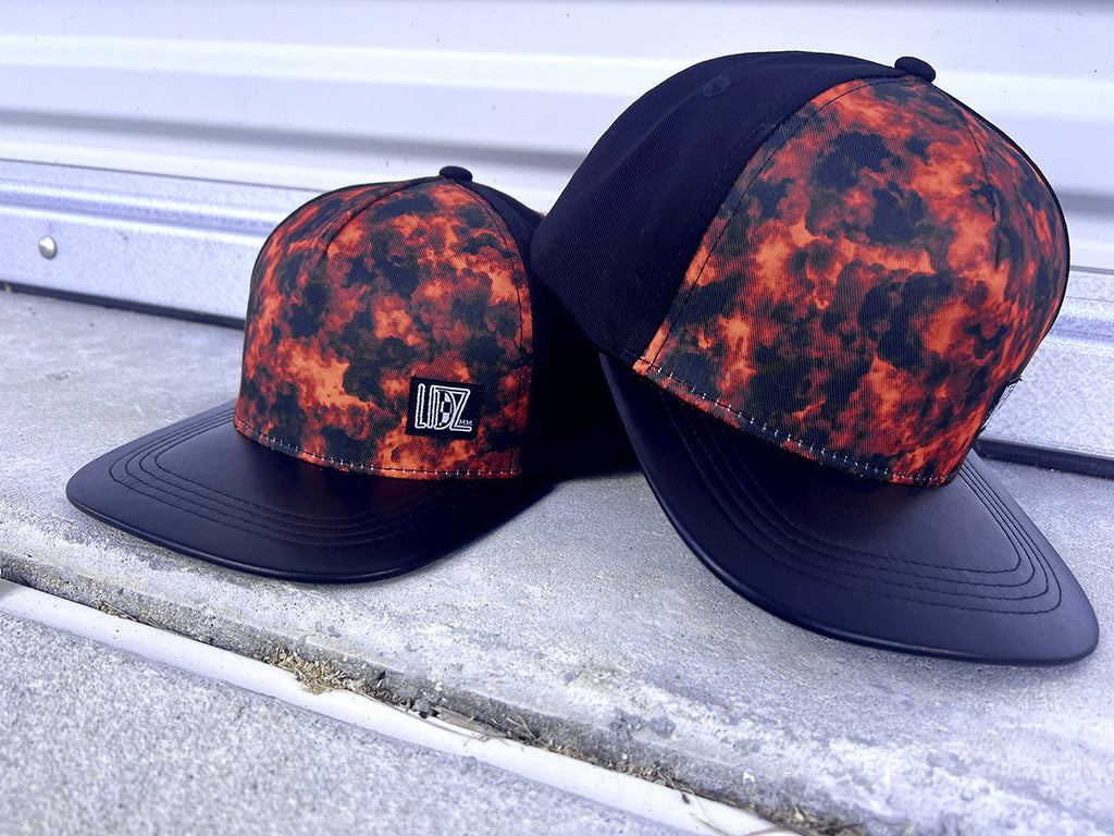 Our FALLoween Tie Dye Exclusive features our custom & exclusive Falloween Tie Dye print with black color blocking, and black leather brim. 5 full panel design, Lidz Logo woven label and our SIGNATURE checkerboard tape detailing. with matching made to order styles from Micro Me