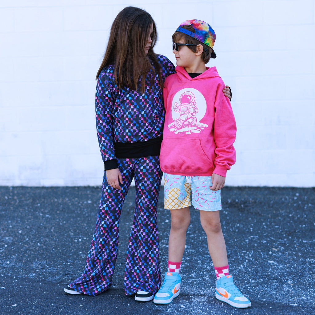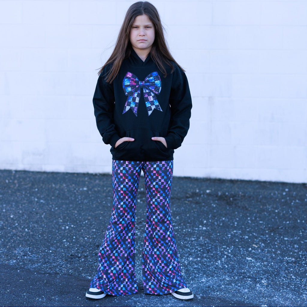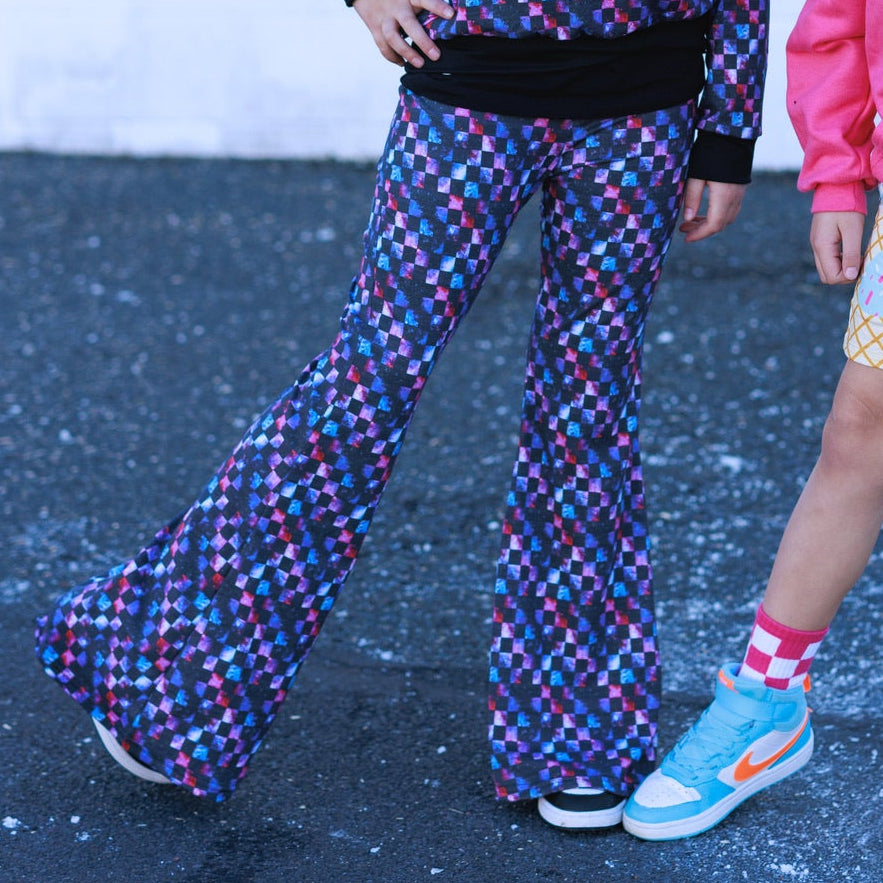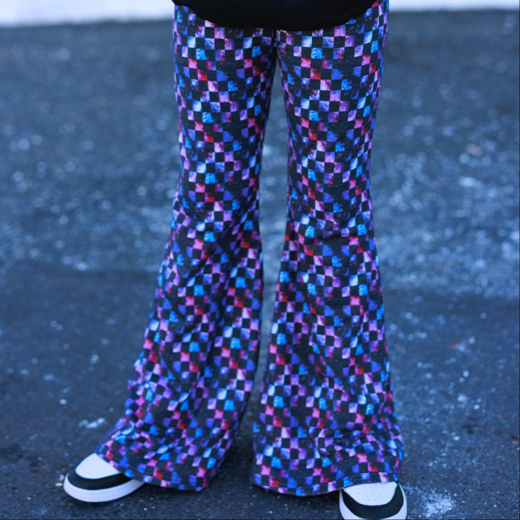These bell bottom pants are designed with comfort and style in mind.  The double brushed poly fabric ensures a soft and cozy feel, perfect for lounging or active play. The unique prints make each pair  a special piece in your wardrobe.