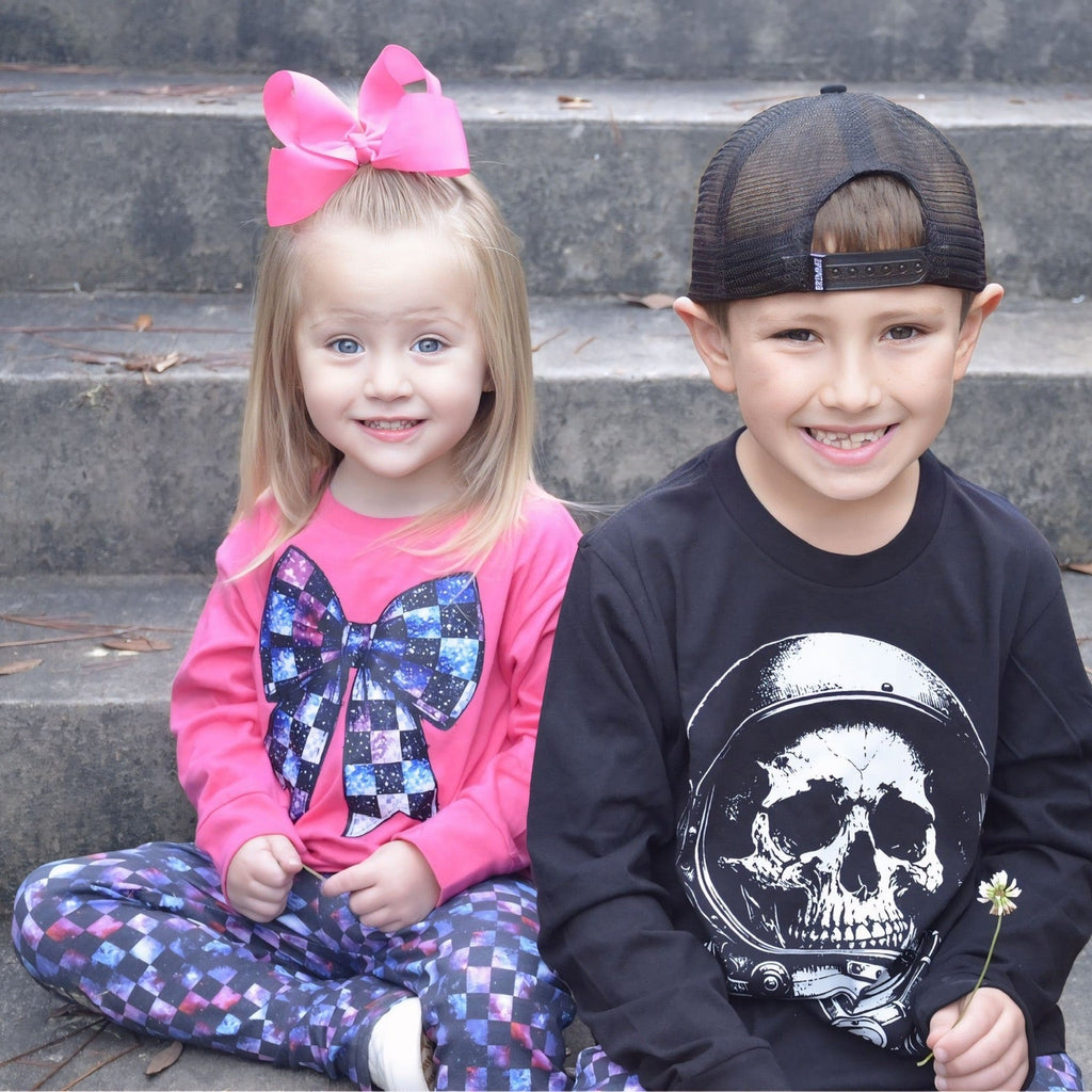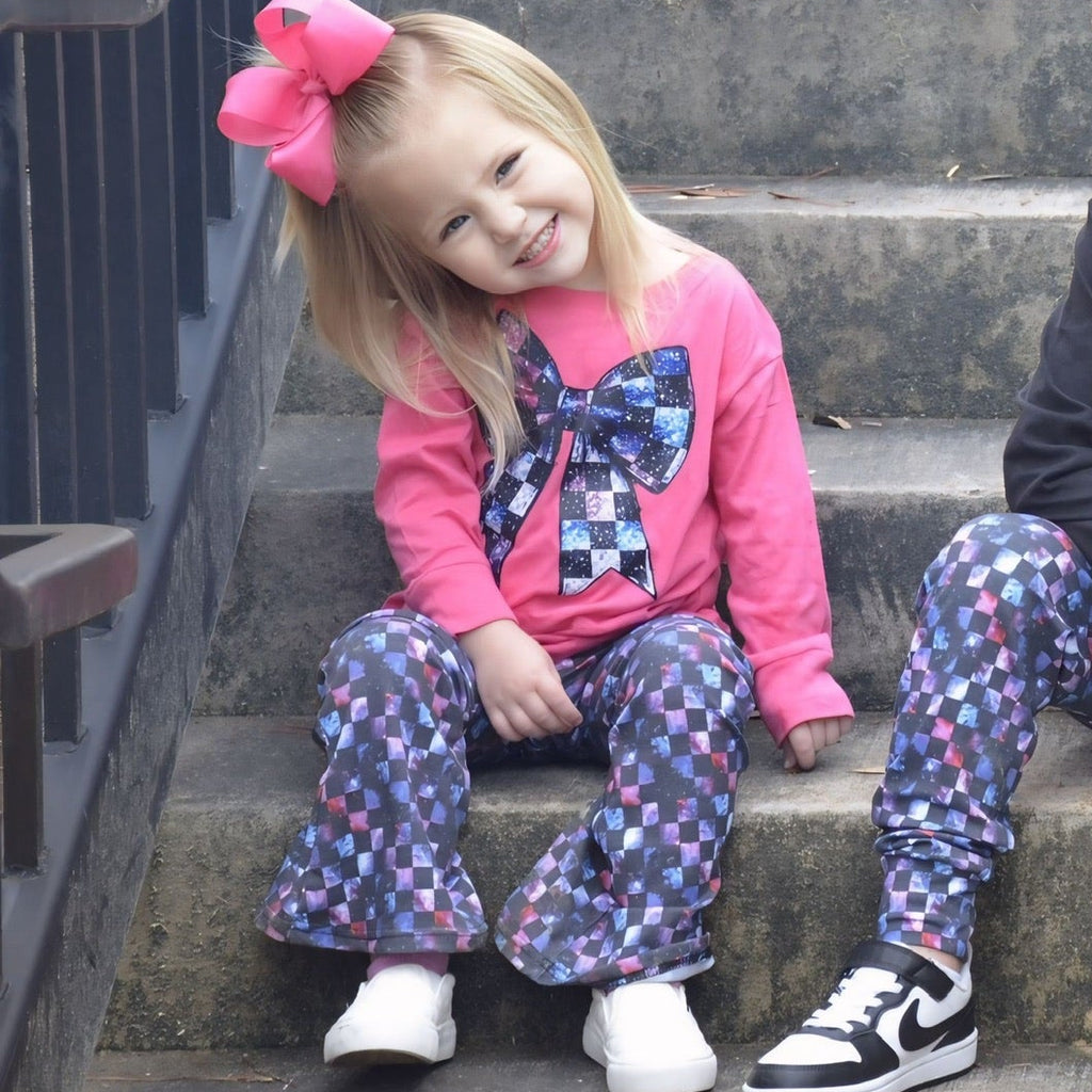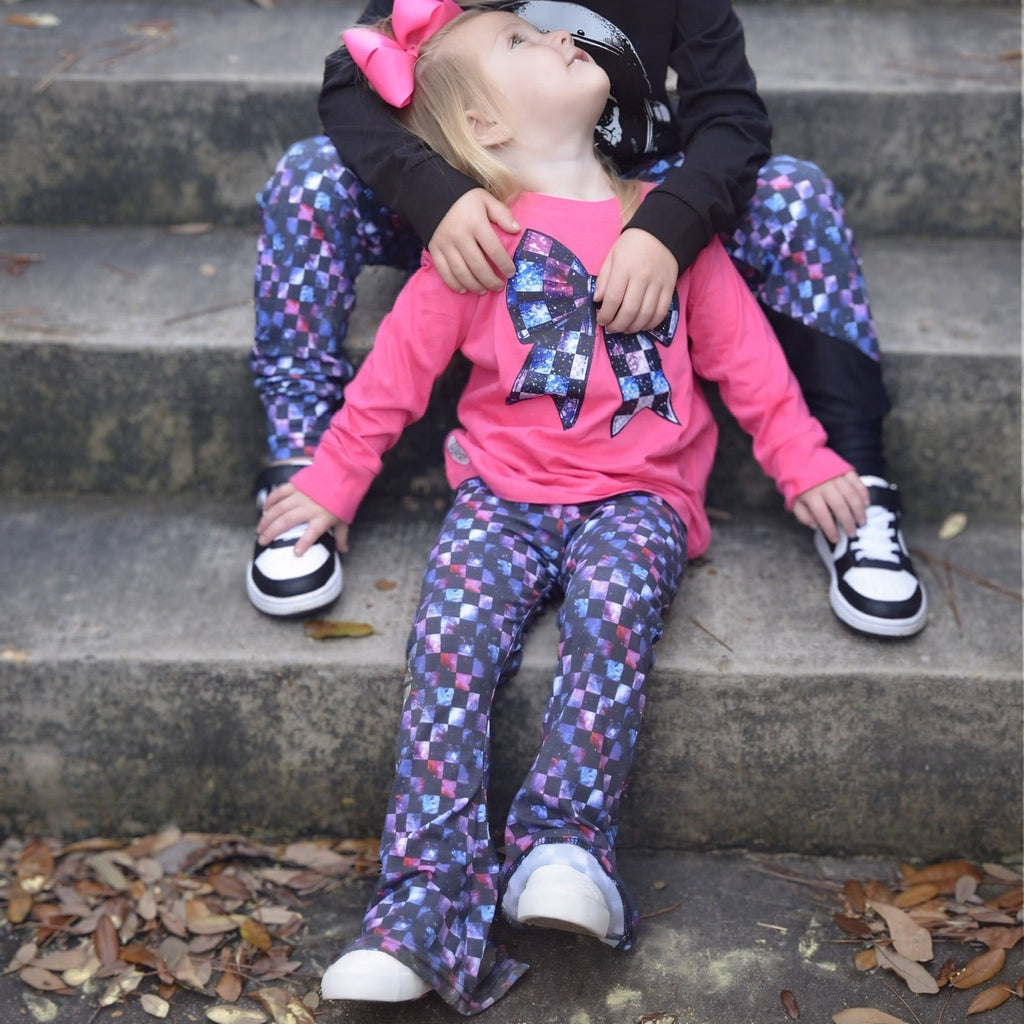 These bell bottom pants are designed with comfort and style in mind.  The double brushed poly fabric ensures a soft and cozy feel, perfect for lounging or active play. The unique prints make each pair  a special piece in your wardrobe.