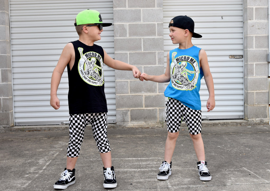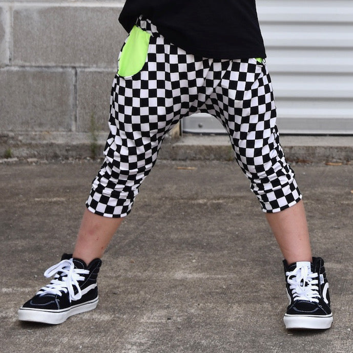 Our signature Lucas shorts are custom designed for a perfect fit!! These shorts will quickly become a fave!   Super soft brushed cotton-poly  fabric,  All the neons, checkerboard, and black!  Hits below knee.  HAND-SEWN. Made in the USA....don't miss these!