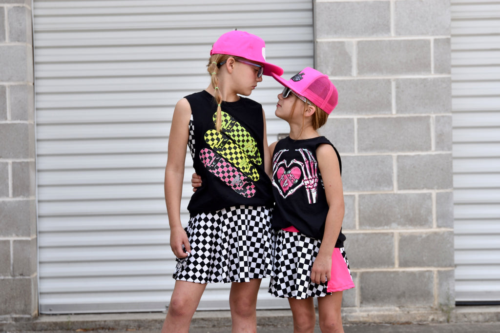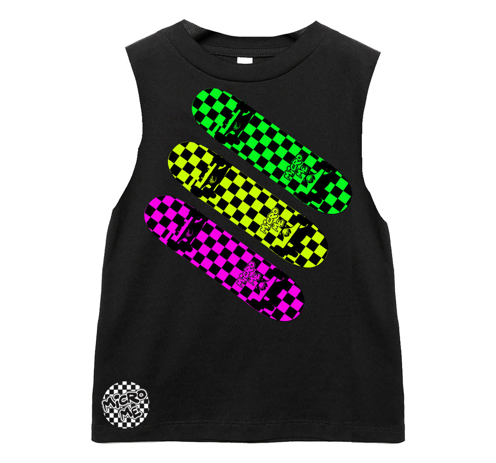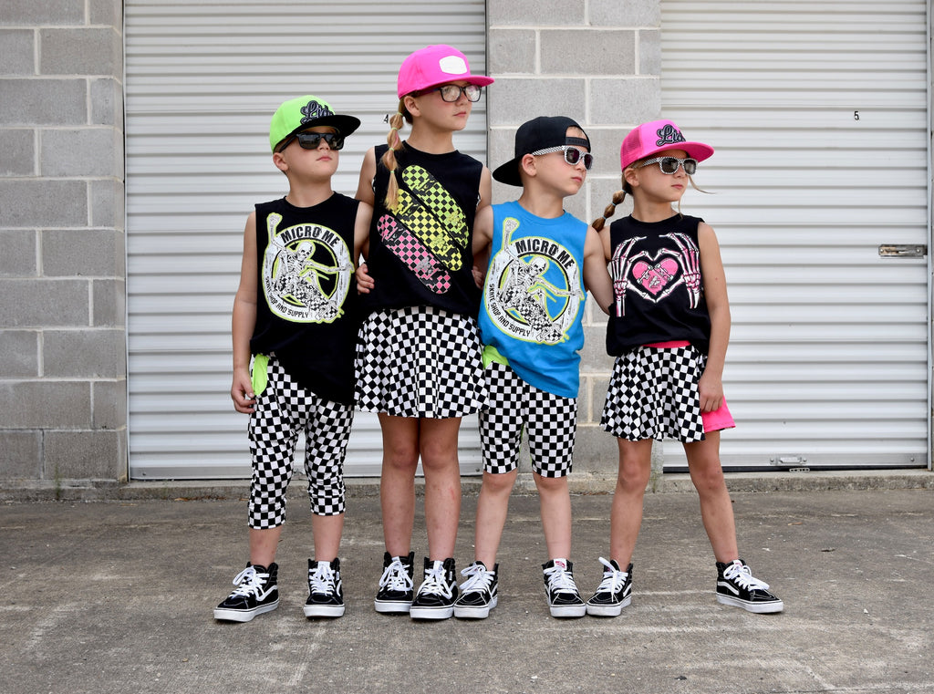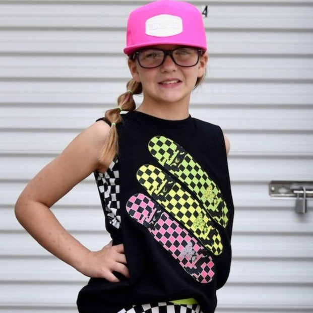 Neon skateboards in checkerboard....of course!   Skate inspired tees for babies, toddlers, kids, youth, and even matching styles for mom & dad!  Our tanks are  our fashionable and soft tees with sleeves cut off. Raw Edges.  ! Made from a soft cotton-poly blend these will quickly become a fave in the closet!