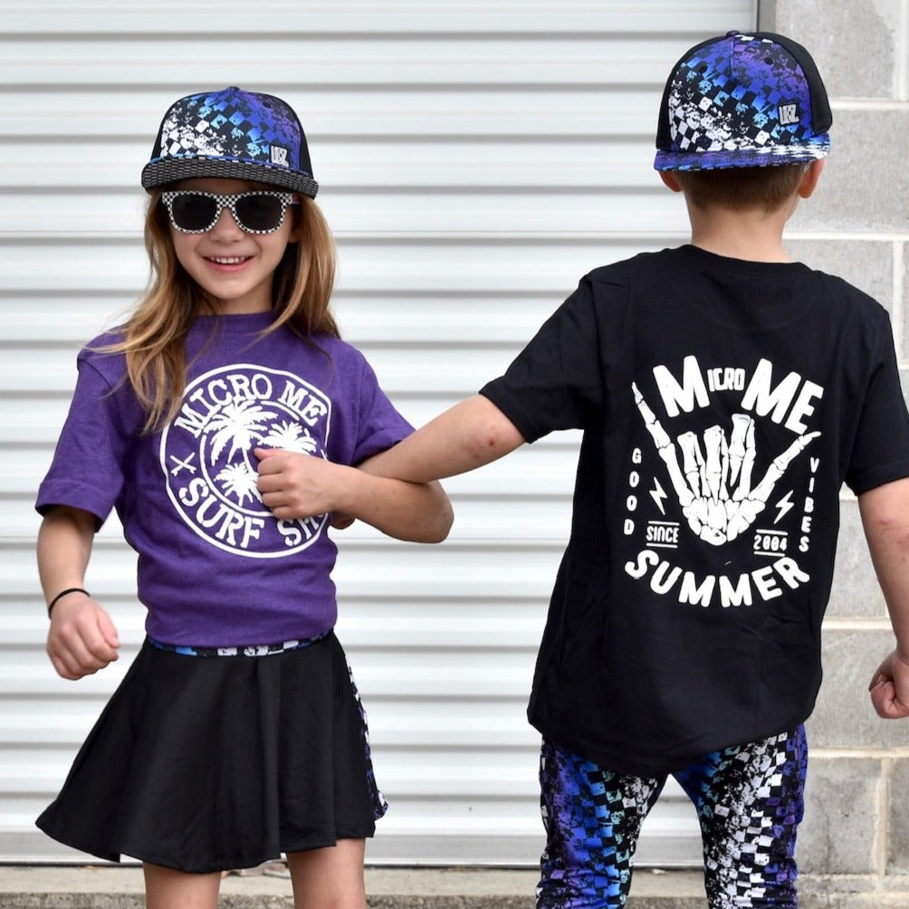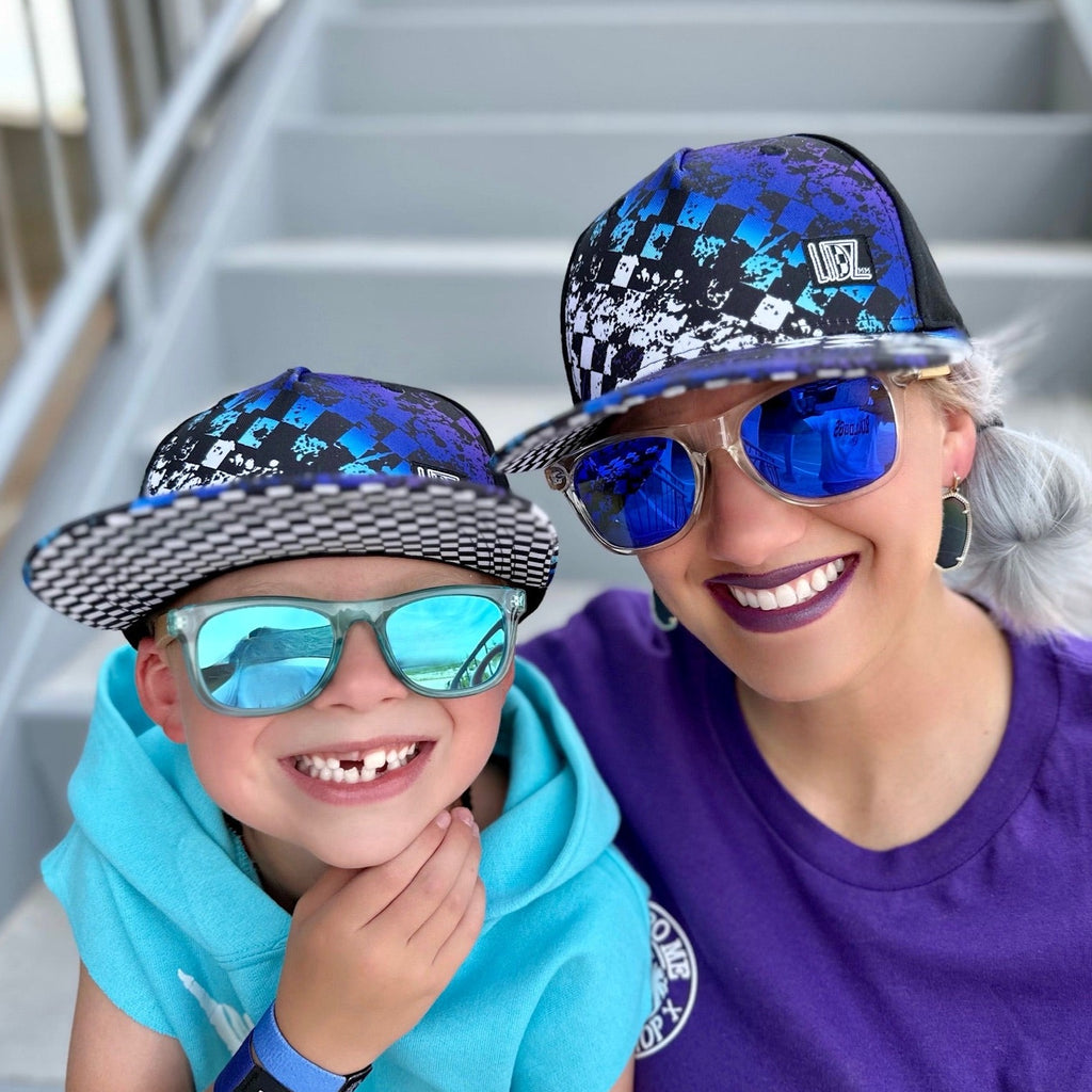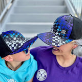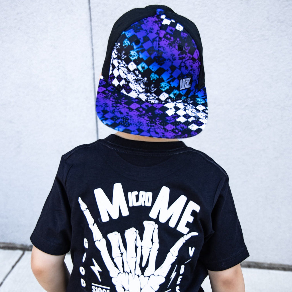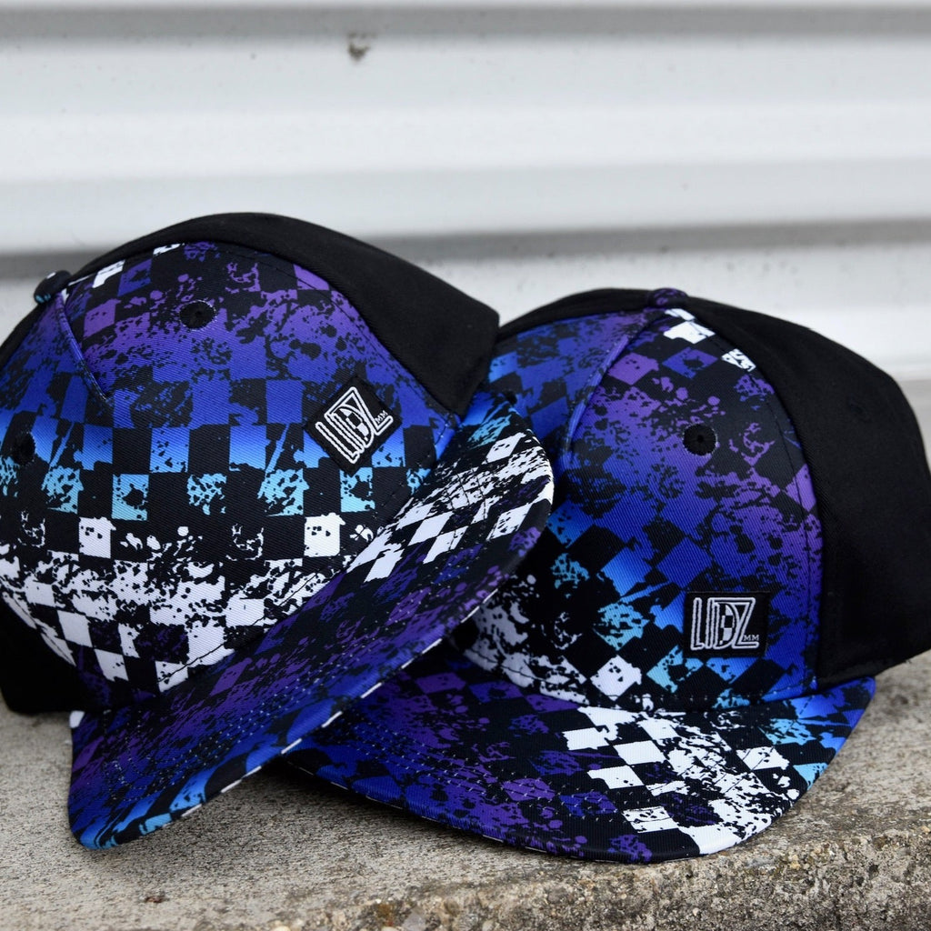 Our Purple Checks Exclusive features our SIGNATURE custom & exclusive distressed checks print, Black 5 full panel design,  Lidz Logo woven label and our SIGNATURE checkerboard tape detailing. Checkerboard under brim, and matching made to order styles from Micro Me