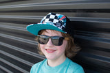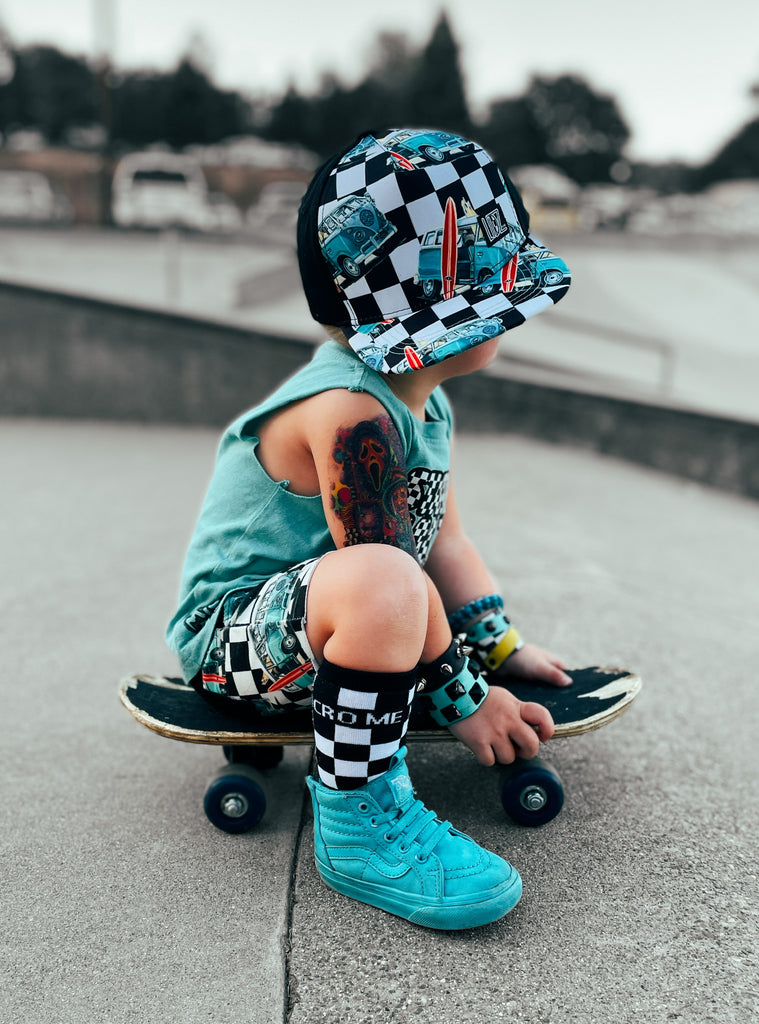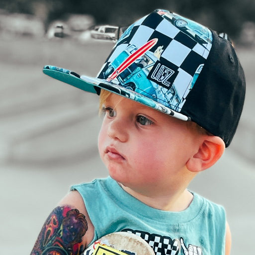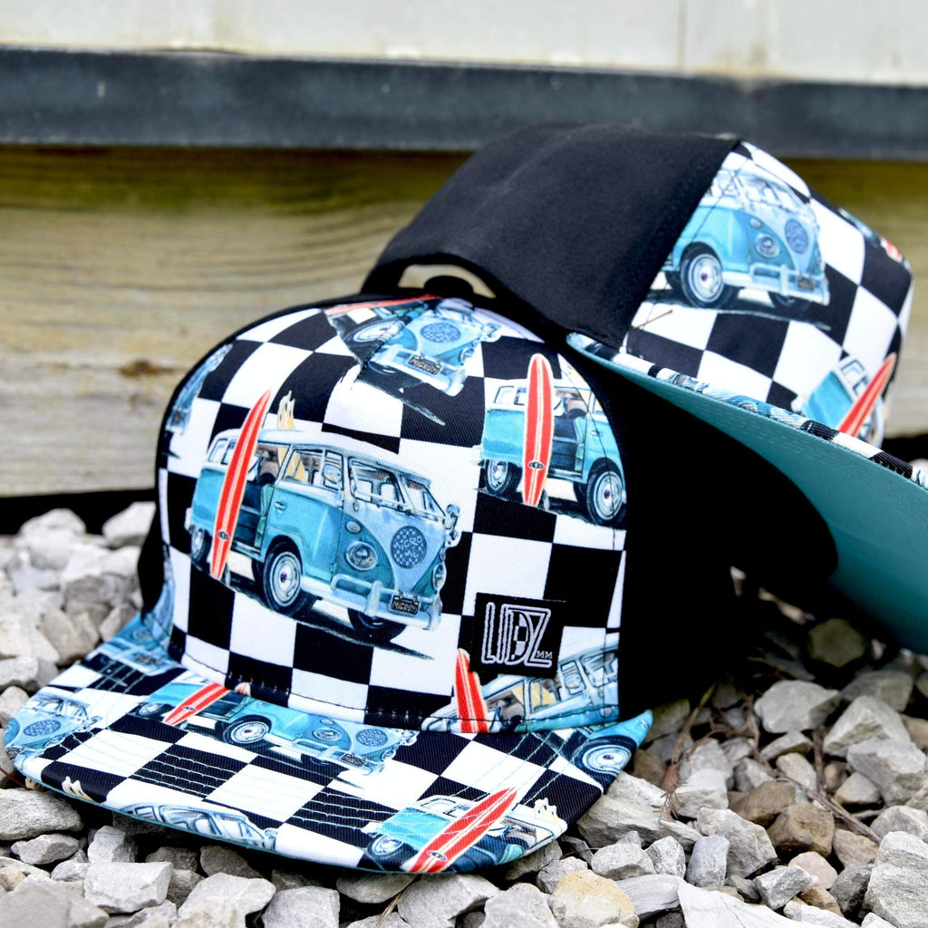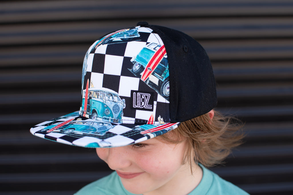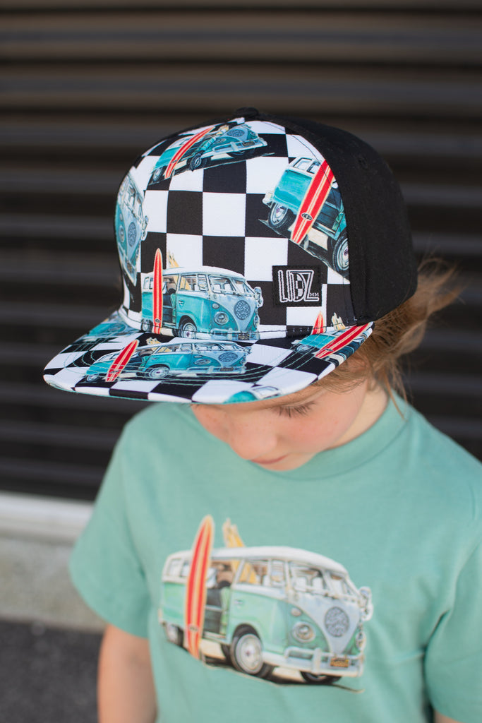 5  panels, snapback, flat brim,  checkerboard tape, Lidz woven label.  All LIDZ custom prints hat will come in full panel snapback style- no mesh.  MM Retro Surf Bus print with checkers for the perfect beach vibes!