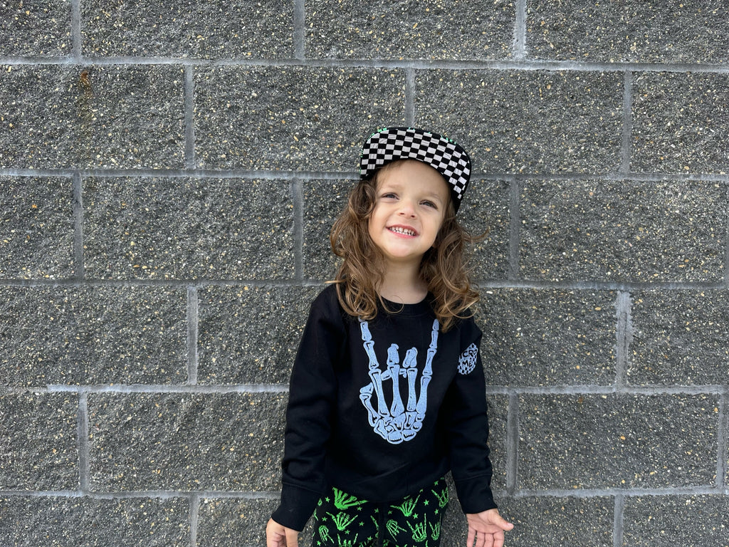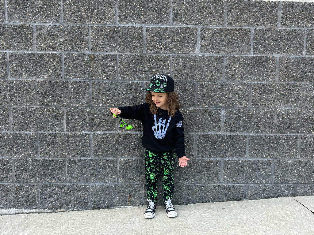 Our exclusive Kids Collection of Glow in the Dark Rock On and Shaka Bones is designed with comfort, style, and fun in mind. Whether your child is rocking their glow in the dark outfit during the day or enjoying the glow-in-the-dark pajamas at night, they are sure to stand out and have a blast with these unique and exciting pieces.